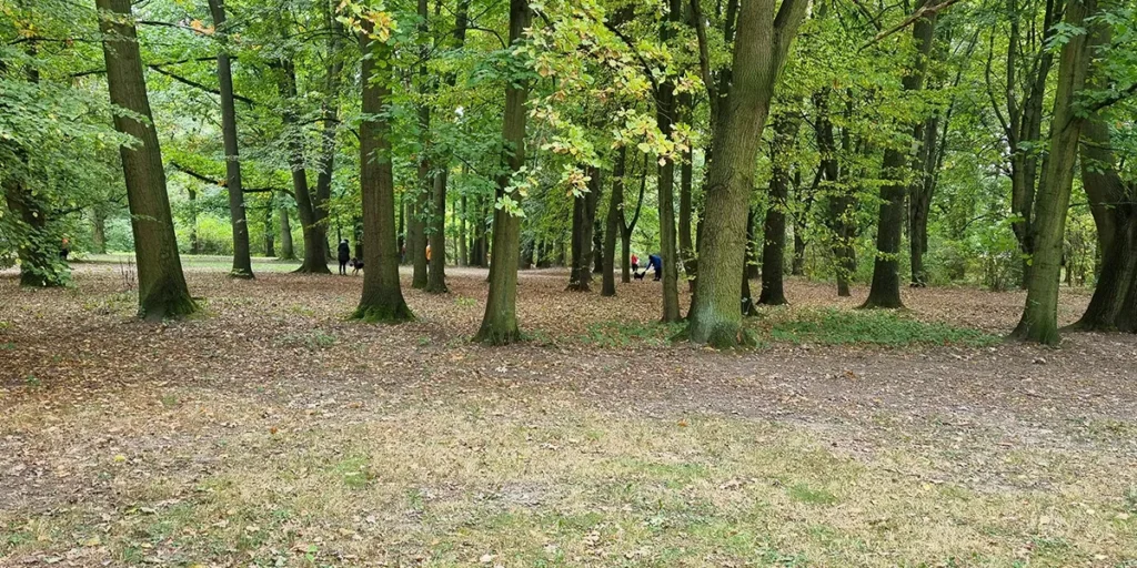 W tygodniu park pozostaje raczej spokojny – w weekendy może przyciągać więcej spacerowiczów i rowerzystów, ale mimo to zachowuje swój wyciszony charakter. Nie ma tu strefy dla psów, więc spacery muszą odbywać się na smyczy i pod kontrolą – ale właśnie to może sprzyjać relacji: obserwacji, dialogowi, spokojnemu rytmowi kroku.